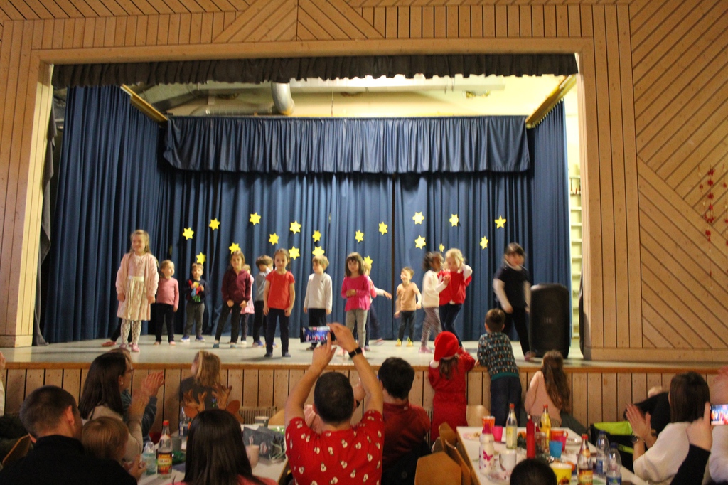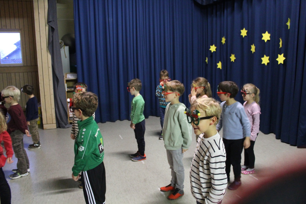 Die Springmäuse tanzten zum Lied „A E I O U Komm lass uns tanzen“. Die Grashüpfer zeigten einen Wichteltanz. Zum Ende des Lieds holten sie noch ihre Mütter und danach