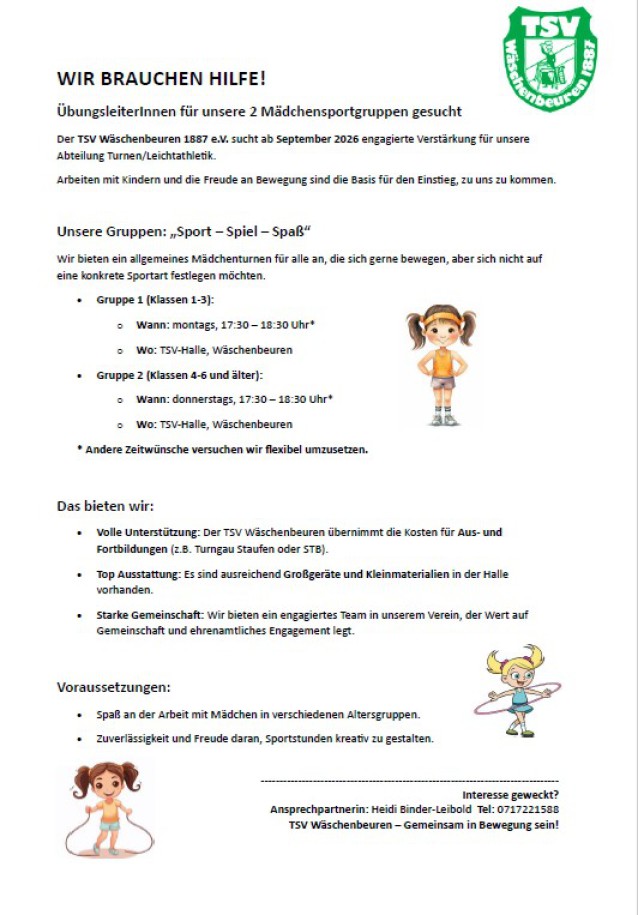 suchen wir ab September 2026 neue, ehrenamtlich tätige Übungsleiter.